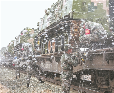 千里機(jī)動至演練地域后,官兵頂風(fēng)冒雪卸載車輛裝備。