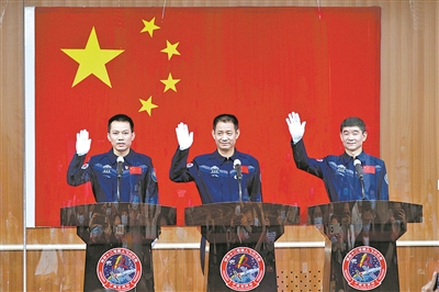 6月16日,神舟十二號(hào)載人飛行任務(wù)航天員聶海勝(中)、劉伯明(右)和湯洪波在酒泉衛(wèi)星發(fā)射中心與記者見面。本報(bào)記者 王衛(wèi)東攝