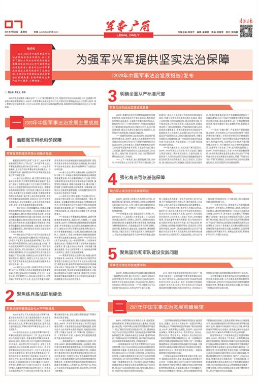 2020年,中國軍事法治發(fā)展亮點眾多、成就顯著,同時也要看到,軍事法治建設(shè)依然任重道遠。站在新起點新征程,中國軍事法治建設(shè)緊緊圍繞我軍建設(shè)“十四五”規(guī)劃布局謀劃和推進各項工作,圍繞推進習(xí)近平法治思想宣傳貫徹、加快推進重點領(lǐng)域軍事政策制度改革、加強練兵備戰(zhàn)法治保障、提高軍隊政法工作服務(wù)備戰(zhàn)打仗質(zhì)量效能、強化維護官兵權(quán)益法治保障等將取得新的成效、實現(xiàn)新的躍升。