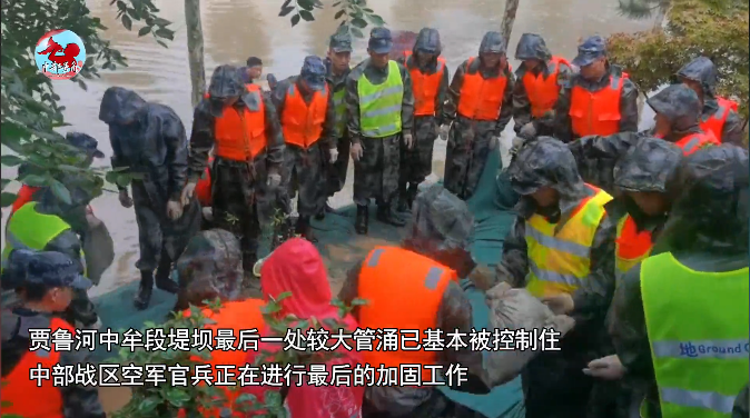 河南省開封市賈魯河祥符區(qū)段的兩處決口,情況危急。21日凌晨,空降兵某旅接到中部戰(zhàn)區(qū)命令,出動650人,車輛38臺,迅速趕赴現(xiàn)場,官兵們采用人工和機械相結(jié)合方式,筑起長1.5公里、高1.2米的沙袋墻,目前已完成大部分河堤加高任務(wù)。