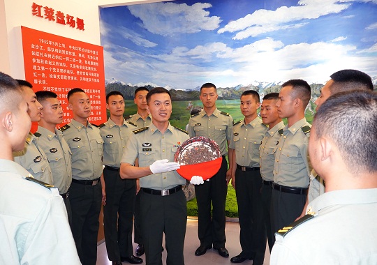圖為“紅一連”指導(dǎo)員鄭紀文為戰(zhàn)士們講解連隊“紅菜盤”的故事。張永進 攝