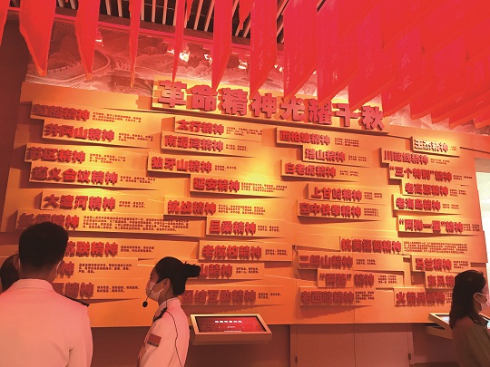 在這面革命精神展墻上,“革命精神光耀千秋 紅色基因代代相傳”紅色大字,向來往的參觀者展示著人民軍隊永不磨滅的紅色精神。