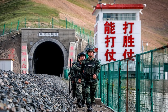 圖為楊富祥(前一)帶領(lǐng)戰(zhàn)士在昆侖山隧道沿線巡邏。楊浩 攝