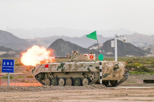圖為中國參賽隊陸軍代表隊對步戰(zhàn)車目標(biāo)進行實彈射擊。王俊 攝