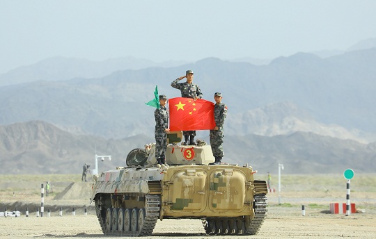 圖為中國參賽隊陸軍代表隊在賽道上疾馳。王俊 攝