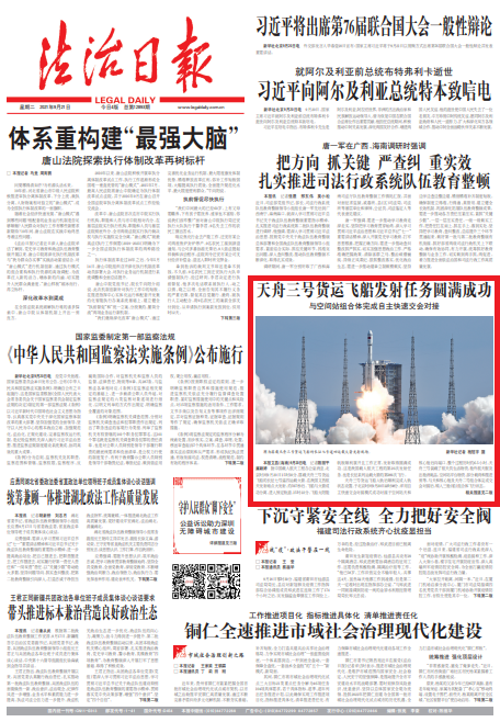天舟三號貨運飛船入軌后順利完成入軌狀態(tài)設(shè)置,于北京時間9月20日22時08分,采用自主快速交會對接模式成功對接于空間站天和核心艙后向端口,整個過程歷時約6.5小時。天舟三號裝載了航天員生活物資、艙外航天服及出艙消耗品、空間站平臺物資、部分載荷和推進(jìn)劑等,與天和核心艙及天舟二號組合體完成交會對接后,轉(zhuǎn)入三艙(船)組合體飛行狀態(tài)。
