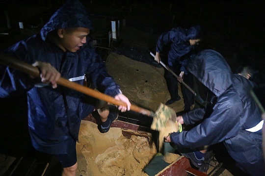 圖為連夜進(jìn)行沙袋裝填。郭強(qiáng)強(qiáng) 董海龍 攝