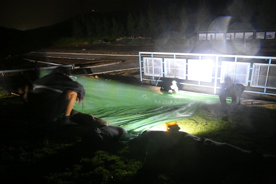 處于海南島最東端的銅鼓嶺測(cè)控點(diǎn),三面環(huán)山、風(fēng)大浪高,地勢(shì)的原因讓這里的防臺(tái)形勢(shì)更加嚴(yán)峻。曾經(jīng),2014年臺(tái)風(fēng)“威馬遜”登陸時(shí),中心風(fēng)力達(dá)17級(jí)。為拯救光學(xué)實(shí)況記錄設(shè)備,測(cè)控點(diǎn)成立突擊小分隊(duì),在狂風(fēng)暴雨中用繩索相互捆綁,成功保住了測(cè)控設(shè)備。這次臺(tái)風(fēng)過(guò)境,點(diǎn)號(hào)航天工作者更是未雨綢繆,提前開(kāi)展臺(tái)風(fēng)形勢(shì)研判,實(shí)地查看風(fēng)險(xiǎn)隱患和防范重點(diǎn)難點(diǎn),緊前加固設(shè)備天線罩,加蓋防雨布層層保護(hù)核心部位,力爭(zhēng)設(shè)備設(shè)施零損失。12日晚,連夜的暴雨導(dǎo)致測(cè)控點(diǎn)綠化斜坡松動(dòng),應(yīng)急分隊(duì)聞令而動(dòng),冒著大雨全力疏通泄洪渠道,壓緊壓實(shí)斜坡,及時(shí)避免了可能帶來(lái)的斜坡塌方和建筑損傷。