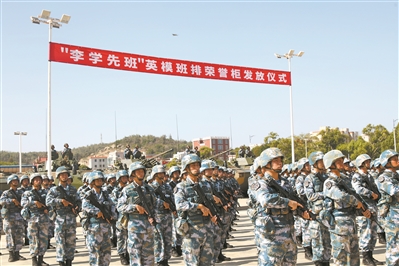 “賡續(xù)光榮傳統(tǒng),爭做‘李學先班’傳人……”軍委政治工作部為獲得重大榮譽的英模班排制作的榮譽柜下發(fā)部隊后,海軍陸戰(zhàn)隊某旅第一時間舉行榮譽柜發(fā)放儀式,為前身為“李學先班”的機步四連二班發(fā)放榮譽柜。