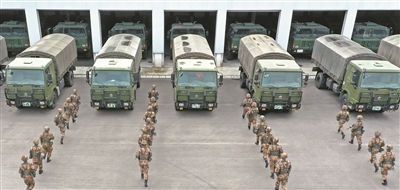 一聲令下,官兵快速登車出征。
