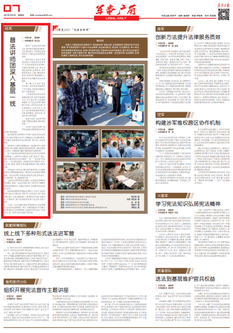 陸軍部隊(duì)立足法治軍營(yíng)建設(shè)特點(diǎn),抽組部隊(duì)法律骨干,在各級(jí)組建普法講師團(tuán),從基層“需求側(cè)”出發(fā),常態(tài)開(kāi)展法治授課、法律咨詢(xún)、涉軍維權(quán)等活動(dòng),讓最了解各級(jí)官兵的“法律專(zhuān)家”提供最貼心、最有針對(duì)性和操作性的法律服務(wù)。