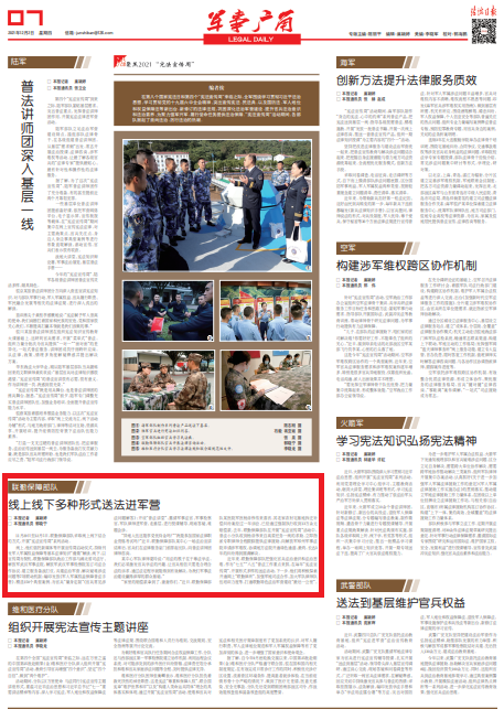 近年來(lái),聯(lián)勤保障部隊(duì)把強(qiáng)化官兵法治意識(shí)和法治思維,作為“七五”“八五”普法工作重點(diǎn)來(lái)抓。在每年“憲法宣傳周”,開(kāi)展形式多樣的送法活動(dòng)。下一步,他們將積極探索開(kāi)通網(wǎng)上“聯(lián)勤律所”、加強(qiáng)軍地司法合作、加大軍隊(duì)律師隊(duì)伍培訓(xùn)力度等,打通聯(lián)勤特色法治軍營(yíng)建設(shè)“最后一公里”。