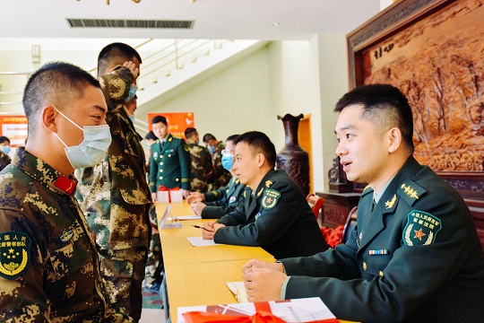 圖② 青海軍地法官向官兵代表贈送法律書籍。羅元凱 攝
