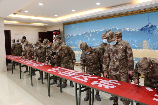 圖⑤ 在憲法宣傳活動簽名儀式上,西部戰(zhàn)區(qū)第二軍事法院組織某部官兵簽名。王自武 王金龍 攝