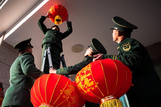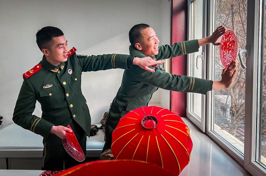春節(jié)臨近,駐守在雪域高原的武警青??傟犛駱渲ш牴俦鴴鞜艋\、貼窗花、寫春聯(lián),把軍營裝扮得溫馨祥和。