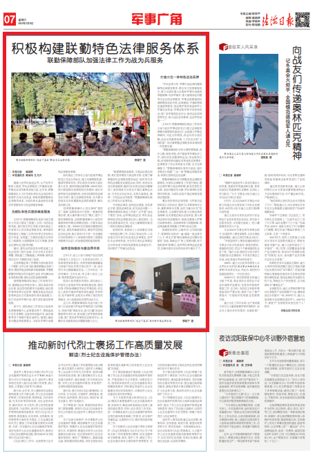 “聯(lián)勤保障部隊平時從事軍需能源、醫(yī)療衛(wèi)勤、物資采購、資產(chǎn)儲備等軍事經(jīng)濟工作,戰(zhàn)時涉及武器彈藥運送、藥品耗材訂購、民用物資和設(shè)施征用等諸多法律事務(wù),法律服務(wù)工作必須具備全天候、全方位保障能力。”聯(lián)勤保障部隊領(lǐng)導(dǎo)介紹說,他們多維設(shè)計構(gòu)建“三位一體”聯(lián)勤法律服務(wù)體系,積極打造特色法治品牌。