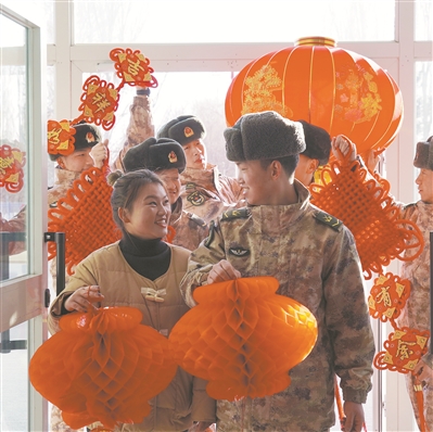 王萬果夫婦與連隊(duì)官兵一起貼春聯(lián)、掛燈籠,營(yíng)造節(jié)日喜慶氛圍。