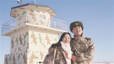 站在邊關(guān)哨所旁,軍嫂范婷婷和丈夫魏能凱深情凝望家鄉(xiāng)的方向。