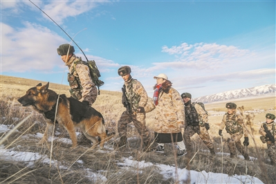 軍嫂歐陽冬梅跟著丈夫宣偉(左二)和戰(zhàn)友巡邏,體驗(yàn)戍守邊關(guān)的艱辛。