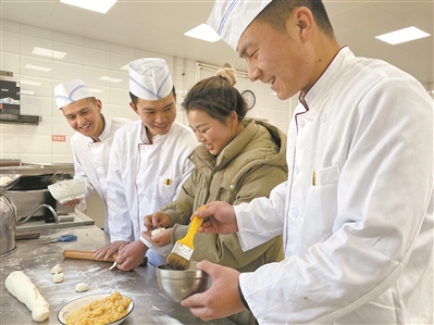 軍嫂廖夢(mèng)楠特意從老家?guī)眇W料,和丈夫王萬果(左二)一起為官兵包包子,讓他們品嘗自己家鄉(xiāng)的味道。