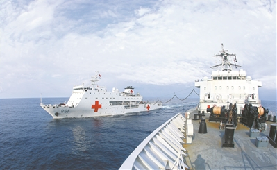 抵達(dá)補(bǔ)給海域后,醫(yī)療船快速占領(lǐng)補(bǔ)給陣位。官兵們在補(bǔ)給艦和醫(yī)療船之間架起承載索,順利完成輸油軟管對(duì)接。海面波浪翻卷,艦船上下起伏,官兵克服困難精準(zhǔn)操縱,成功完成補(bǔ)給。