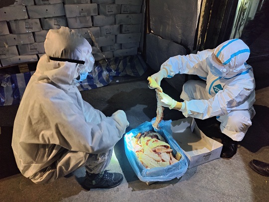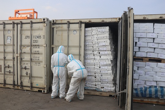 3月13日17時(shí)許,江門海警局根據(jù)情報(bào)獲悉,在江門市黃茅海對(duì)開海域有走私活動(dòng)。該局立即派遣2艘執(zhí)法艇前往目標(biāo)海域進(jìn)行查緝。當(dāng)日18時(shí)許,該局執(zhí)法員通過AIS在目標(biāo)海域發(fā)現(xiàn)一艘可疑船只,遂即拉響警報(bào),表明身份,責(zé)令可疑船只立即停船接受檢查。在可疑船只停船后,經(jīng)執(zhí)法員登臨檢查發(fā)現(xiàn),該船舶上裝載有29個(gè)長(zhǎng)20英尺的集裝箱,集裝箱中載有大量?jī)銎罚瑑銎吠獍b上均有明顯的外文標(biāo)識(shí),由于天氣炎熱且船上沒有任何冷鏈保存裝置,部分凍品已出現(xiàn)腐敗發(fā)臭跡象,隨船未發(fā)現(xiàn)該批凍品任何合法來源和檢驗(yàn)檢疫證明,執(zhí)法員隨即將涉案船舶及所載凍品依法進(jìn)行查扣。