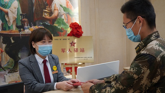 “來(lái)到‘軍人驛站’,看到房間內(nèi)干凈整潔的床上用品,一應(yīng)俱全的配套設(shè)施,充滿濃厚軍旅元素的物品飾件,還有熱情周到的服務(wù),我感覺就像住進(jìn)家里一樣溫馨。”近日,武警機(jī)動(dòng)某支隊(duì)現(xiàn)役警官蔣晨入住江蘇省無(wú)錫市某酒店“軍人驛站”后,談及他的感受。