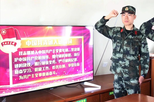 “我志愿加入中國共產主義青年團,堅決擁護中國共產黨的領導……”“就在今天,我光榮地加入了中國共產主義青年團,成為其中一份子。在今后的的訓練工作中,我會更加努力刻苦,嚴格要求自己,把青春夢想融入海疆,立足本職崗位,以青春的名義,志存高遠,腳踏實地,讓自己的青春綻放光彩”。