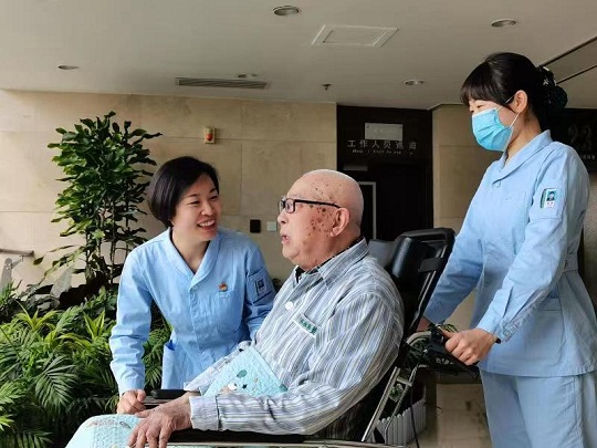 圖為高銳(左一)照護高齡住院患者。汪學(xué)潮 攝