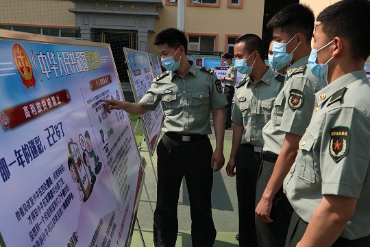 圖為官兵參觀民法典展板。
