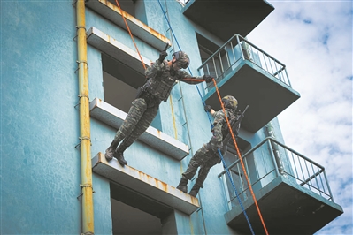 圖③:武警江西總隊新余支隊特戰(zhàn)隊員進行樓房索降突入訓練。曾凡鵬 攝