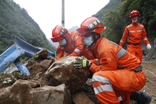 凌晨時(shí)分,李榮吉率領(lǐng)應(yīng)急救援隊(duì)伍,向距離駐點(diǎn)17公里外的大池溝村疏通道路,巨龍般的救援部隊(duì)沿315國(guó)道時(shí)而盤山而上,時(shí)而環(huán)山而下。由于不間斷的余震,不時(shí)有石頭和泥沙從頭頂飛下,一路上官兵們遇到多次塌方,公路全被亂石和爛泥淹沒(méi),很多地方無(wú)路可走。