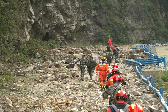 面對(duì)種種困難,官兵沉著應(yīng)戰(zhàn),踩著松軟的泥漿、尖銳石塊,沿著泥濘的山路,一步一步踉蹌前行。他們一邊冒險(xiǎn)搶修道路,一邊爭(zhēng)分奪秒晝夜兼程向受災(zāi)最重的方向突擊開(kāi)進(jìn)。