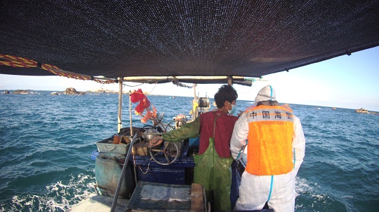 圖為執(zhí)法員立即聯(lián)系當(dāng)?shù)貪O民利用“小舢板”一同進(jìn)行協(xié)助救援。