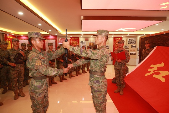 圖為第80集團(tuán)軍某旅“紅八連”在榮譽(yù)室舉行新兵下連授槍儀式。仇成梁 攝