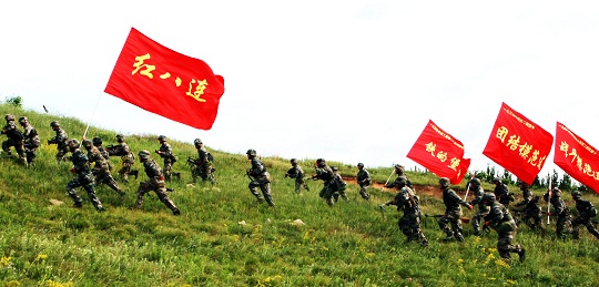 圖為第80集團(tuán)軍某旅“紅八連”官兵在旗幟的指引下向又一個(gè)高地發(fā)起沖鋒。曹鵬 攝