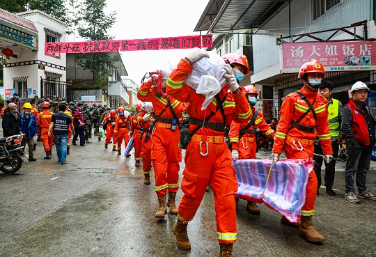 圖為武警涼山支隊官兵采取肩扛手抬的方式開展救援工作。