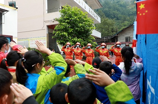 圖為武警涼山支隊官兵和石棉縣草科藏族鄉(xiāng)小學學生們互敬軍禮。