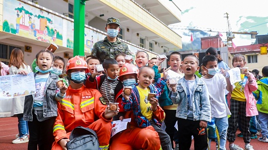 圖為武警涼山支隊官兵和石棉縣草科藏族鄉(xiāng)小學學生們在一起。