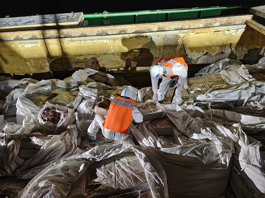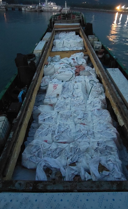 經(jīng)查,該嫌疑船艙內(nèi)滿裝大量白色編制袋貨物一批,經(jīng)開箱查驗(yàn),發(fā)現(xiàn)箱內(nèi)裝有涉嫌走私雪花牛肉、牛黃喉、牛百葉等來源不明凍品,共約200余噸。隨船人員均未能提供船舶證件及該批貨物合格來源相關(guān)證明,隨即執(zhí)法員依法對(duì)涉案船舶及所載凍品進(jìn)行查扣。