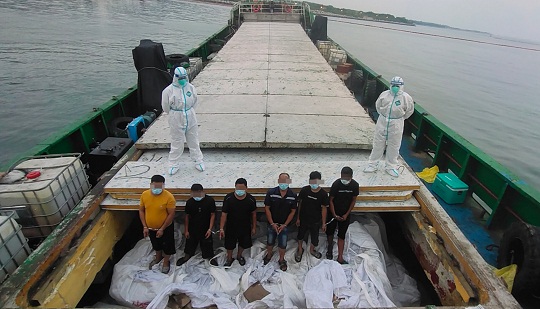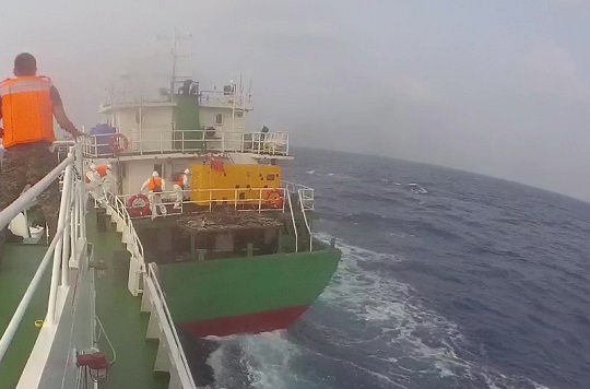 當(dāng)日7時(shí)55分,海上風(fēng)浪較大,執(zhí)法艇與前來增援的多艘執(zhí)法艇一起對(duì)其進(jìn)行圍堵攔截,在執(zhí)法艇與該嫌疑船船尾相靠瞬間,執(zhí)法員找準(zhǔn)時(shí)機(jī)對(duì)其進(jìn)行強(qiáng)制跳幫,并強(qiáng)行控制目標(biāo)船只,現(xiàn)場(chǎng)查控嫌疑人6名。