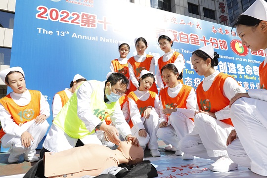 有研究顯示:我國每年猝死發(fā)生數(shù)量已經(jīng)由10多年前的54.5萬增加到100萬人左右,其中65%發(fā)生在頭10分鐘左右的時間內,常常發(fā)生在家中、工作崗位、公共交通或活動等場所,我國每年因創(chuàng)傷就醫(yī)人數(shù)達6200萬人次,致死70萬人,其中25%約17.5萬人是在10分鐘內死于現(xiàn)場。為了滿足軍地急救需要,何忠杰主任醫(yī)師團隊于2010年10月10日10時,發(fā)起“白金十分鐘全國自救互救志愿服務聯(lián)盟”,開展“急救白金十分鐘·全國自救互救日”公益活動?;顒右唤?jīng)推出,醫(yī)療同行和廣大軍民群眾踴躍參加,“科普技術+白金十分鐘MV+廣場舞大賽”的“自救互救日”文化悄然興起,在補齊了應急急救鏈的同時挽救了更多人的生命。