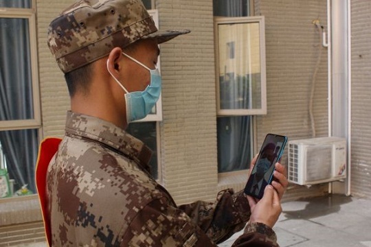 圖為預(yù)定新兵小朱撥打視頻電話(huà)與法院唐庭長(zhǎng)進(jìn)行交流。