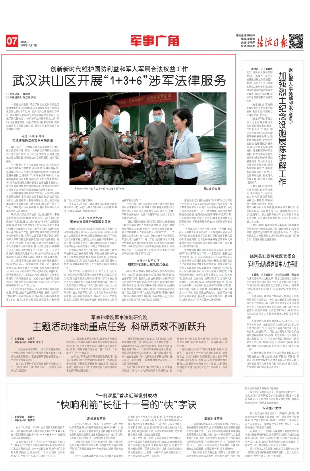 “無(wú)論是轄區(qū)駐軍部隊(duì),還是外地洪山籍官兵及家屬,都可以通過(guò)司法擁軍服務(wù)網(wǎng)絡(luò),獲得‘全天時(shí)’‘零距離’公共法律服務(wù),讓涉法涉訴問(wèn)題辦理更省事、省心、省力,真正實(shí)現(xiàn)司法擁軍服務(wù)對(duì)象全覆蓋?!焙樯絽^(qū)委書(shū)記林文書(shū)說(shuō)。