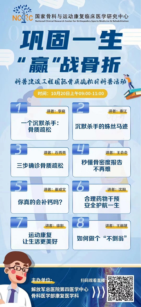 本報(bào)訊 見習(xí)記者韓瀟 通訊員李曉 石秀秀 10月20日,是世界衛(wèi)生組織確立的“國際骨質(zhì)疏松日”,今年中國的主題是“鞏固一生,贏戰(zhàn)骨折”。解放軍總醫(yī)院第四醫(yī)學(xué)中心骨科醫(yī)學(xué)部康復(fù)醫(yī)學(xué)科充分利用國家骨科與運(yùn)動康復(fù)臨床醫(yī)學(xué)研究中心平臺,即骨科與運(yùn)動康復(fù)領(lǐng)域唯一的國家級臨床醫(yī)學(xué)研究中心,在“科普建設(shè)工程”版塊開展線上科普宣傳活動?;顒又?,共有1萬余名患者及家屬登陸直播間觀看。這是該醫(yī)學(xué)部貫徹落實(shí)“健康中國2030發(fā)展綱要”的實(shí)際行動,目的是關(guān)注全國軍民各個年齡段骨骼健康,引導(dǎo)遠(yuǎn)離骨質(zhì)疏松危害,降低發(fā)生脆性骨折的風(fēng)險,提高健康生活質(zhì)量。