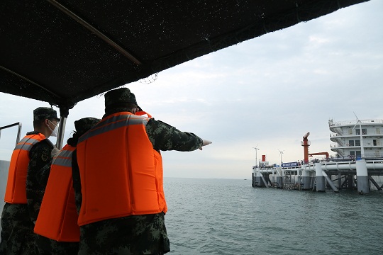 圖為山東海警局執(zhí)法員檢查涉海平臺建設(shè)情況。盧煜萱 攝