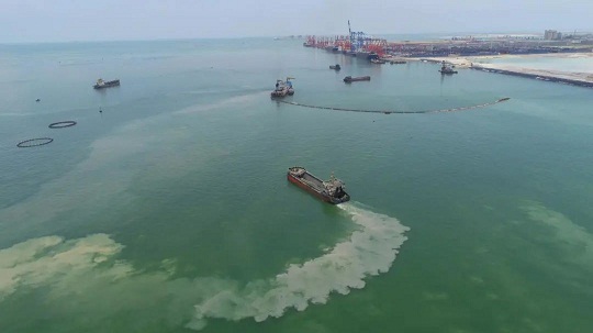圖為廣西海警發(fā)現(xiàn)泥駁船正在向海洋傾倒廢棄物。