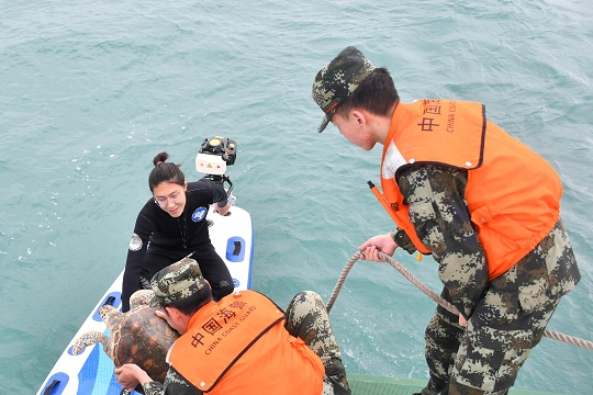 圖為海南海警局執(zhí)法員發(fā)現(xiàn)迷路“綠海龜”將其移交給研究所工作人員送回保護(hù)區(qū)。吳昊 攝