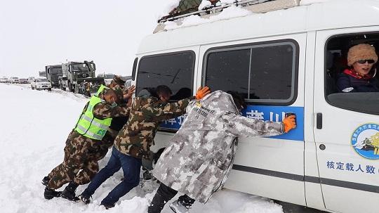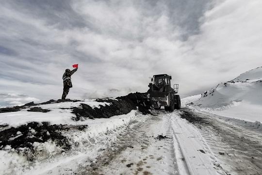 圖為在海拔4658米的業(yè)拉山上,官兵執(zhí)行冬季清雪除冰任務(wù)。