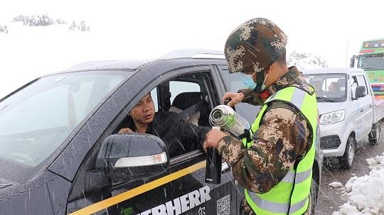 如果說夏秋兩季是和土石做斗爭(zhēng),那冬春季就是和冰雪搶地盤。每年11月至次年4月,養(yǎng)護(hù)路段平均積雪深20厘米,暗冰也有10厘米厚。2021年4月,連夜降雪導(dǎo)致一臺(tái)電建部門的車輛陷入邊溝,亟待救援。中隊(duì)接到命令后,立即準(zhǔn)備熱水、干糧、大衣等物資前往事發(fā)地,因天氣條件惡劣、施工道路狹窄,大型裝備無法展開,導(dǎo)致救援工作異常緩慢。官兵們?cè)诹阆?0攝氏度的低溫條件下,肩扛手刨,連續(xù)奮戰(zhàn)6個(gè)小時(shí),硬是將失事車輛抬出邊溝。任務(wù)結(jié)束后,不少人凍得滿臉青紫,連話都說不出來。